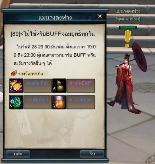 ในวันที่ 28 29 30 มีนาคม ผู้เล่นที่มีเลเวลเกิน 30 สามารถไปที่ NPC ในเมืองฝูโจว เพื่อรับรางวัล