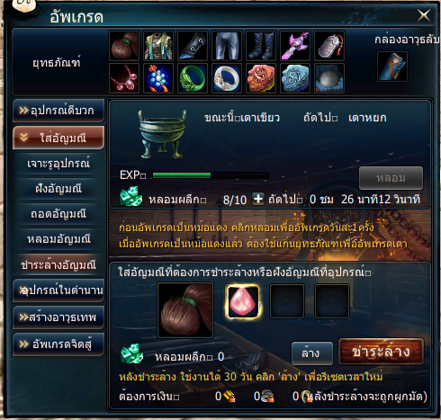 สำหรับการเปิด : กดเปิดกระเป๋า > ยุทธภัณฑ์เพิ่ม > ใส่อัญมณี > ชำระล้างอัญมณี