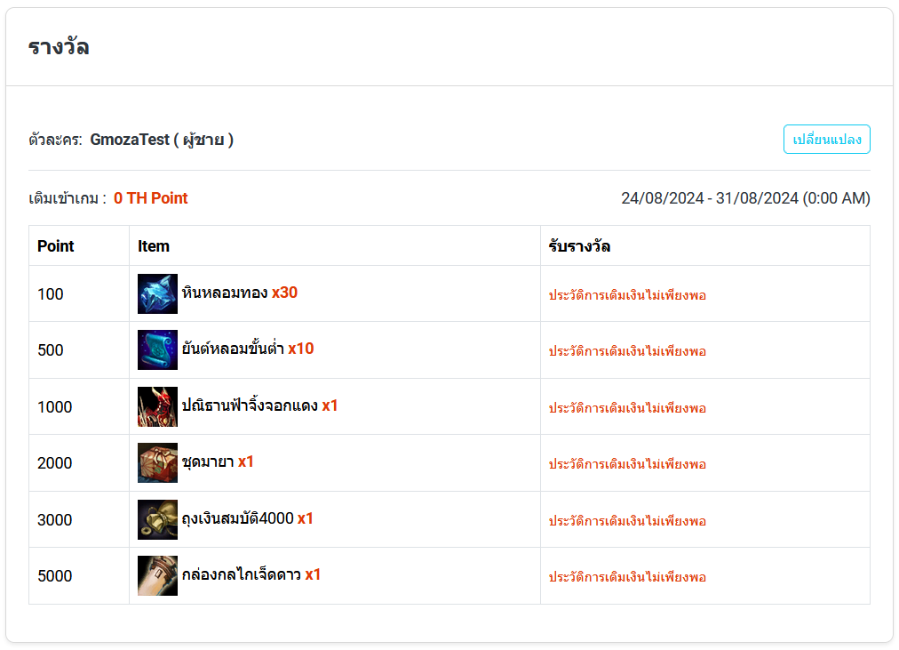3. รับรางวัลด้วยตามจำนวนแต้มที่ได้เติมเงินเข้าเกม (สามารถรับได้ทันทีหลังเติมเงิน)
